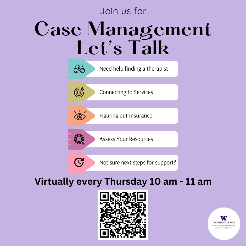 If you need to speak with a mental health consultant urgently than the times listed below, please call Husky HelpLine for support at 206.616.7777 or schedule a 1:1 session with a counselor using our student portal.