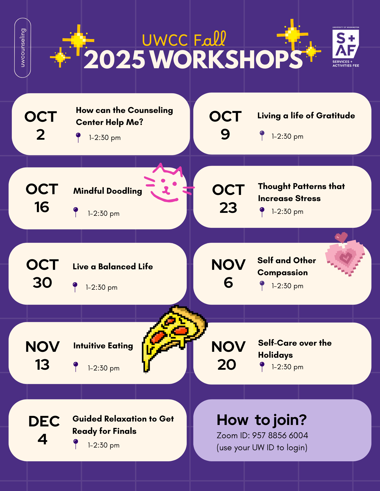 The Counseling Center holds workshops each quarter on a variety of topics designed to help with a variety of concerns.