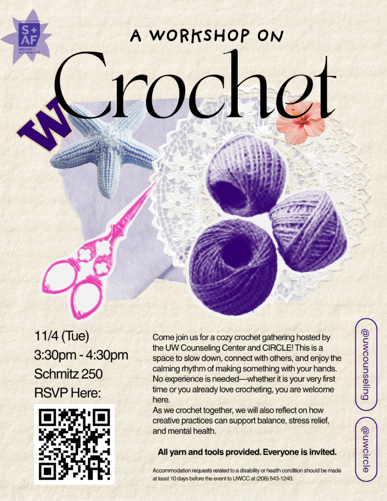 Description: Come join us for a cozy crochet gathering hosted by the UW Counseling Center and CIRCLE! This is a space to slow down, connect with others, and enjoy the calming rhythm of making something with your hands. No experience is needed — whether it is your very first time or you already love crocheting, you are welcome here. As we crochet together, we will also reflect on how creative practices can support balance, stress relief, and mental health.