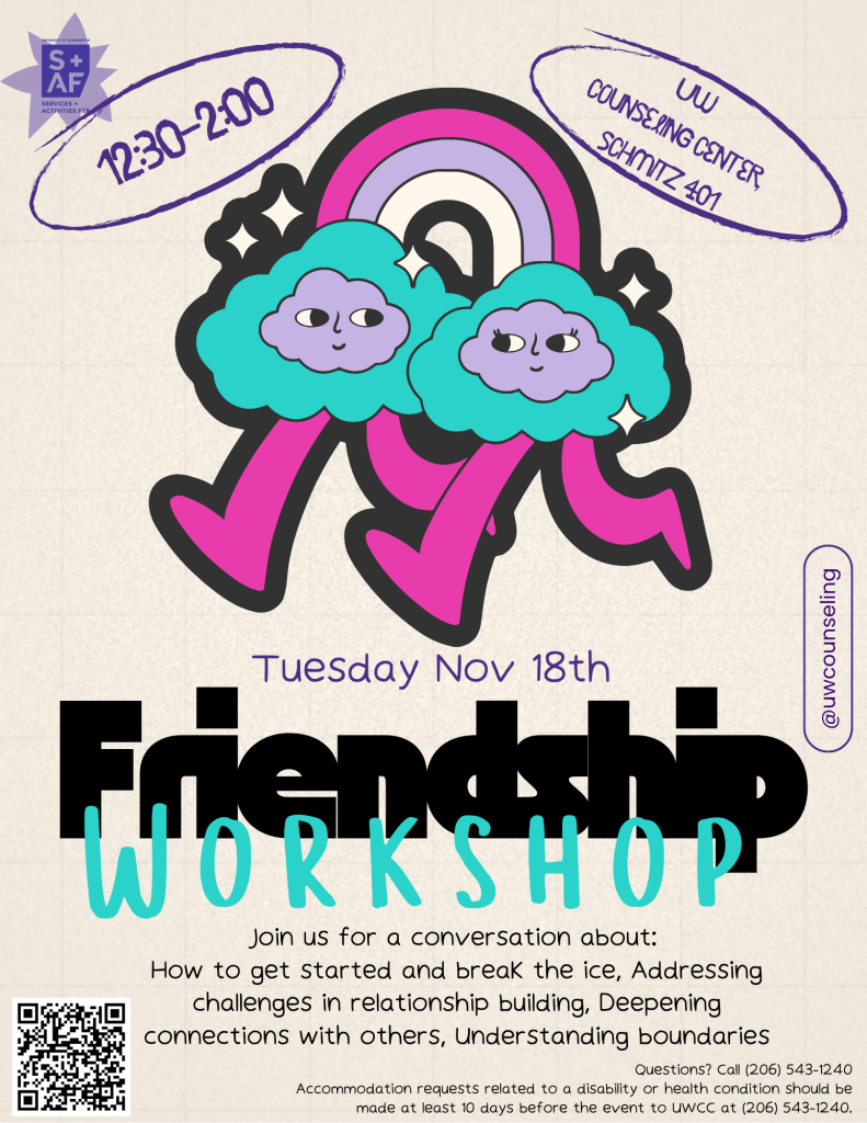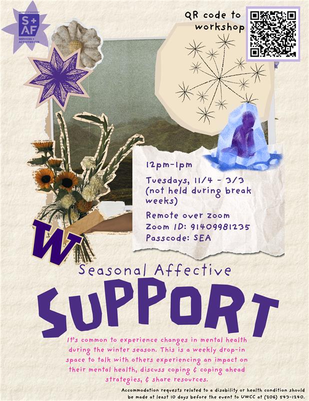The University of Washington is committed to providing access and accommodation in its services, programs, and activities. To make a request connected to a disability or health condition, contact University of Washington Counseling Center at (206) 543-1240, at least 10 days before the workshop/event.
