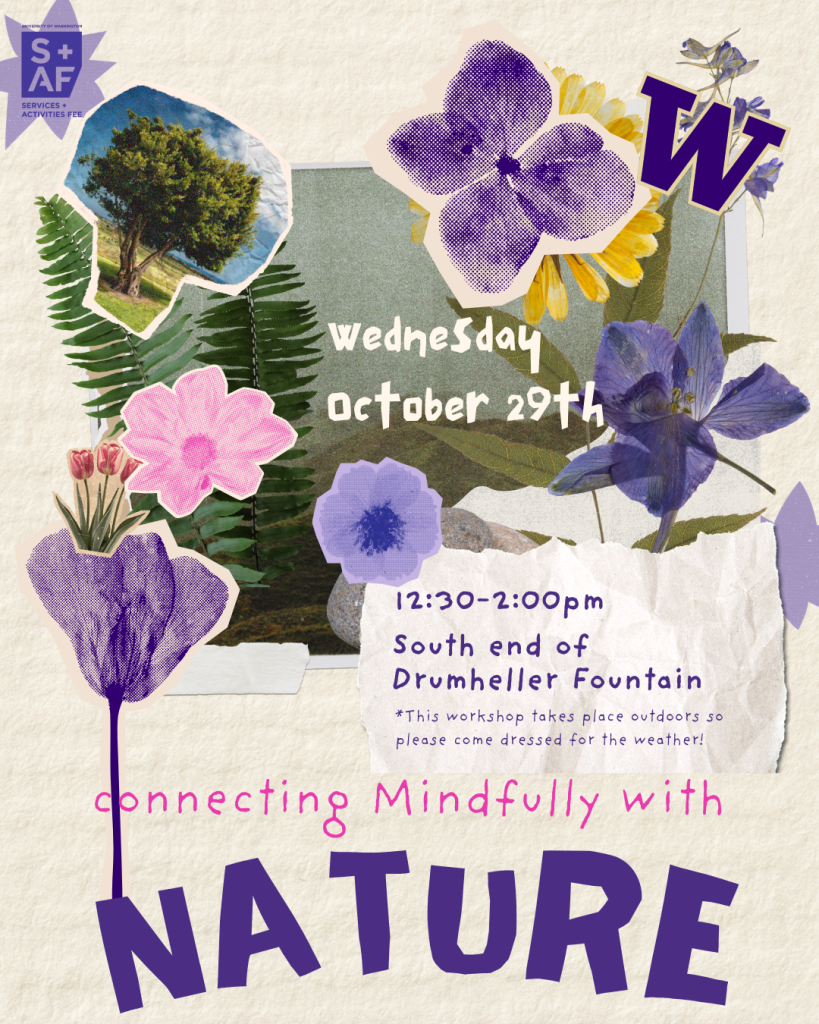 Description: Join us to learn about mindful connection to nature, engage in this practice and connect with others in the process. It’s a wonderful way to take a break and reset, with ideas about how to de- stress from school work and the quarter.