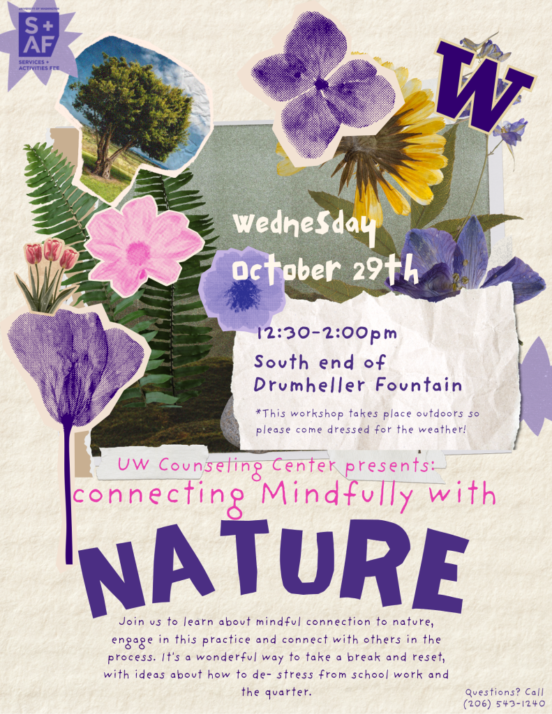 Description: Join us to learn about mindful connection to nature, engage in this practice and connect with others in the process. It’s a wonderful way to take a break and reset, with ideas about how to de-stress from school work and the quarter.